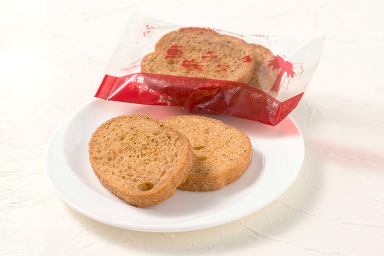 ミネラルたっぷりの上赤糖「亜麻」を使ったラスク。コクのある上品な甘みが特長で、大人気の商品です。常温保管可能で持ち運びにも便利ですので、お土産にもギフトにもおすすめです。